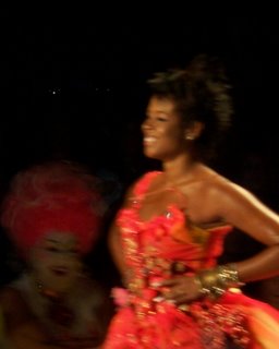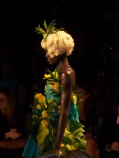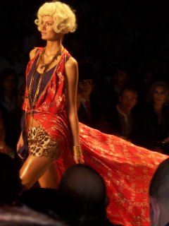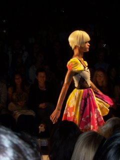 As I’m sure you can see, the actual show was choc full of celebrities. Paris Hilton opened the show…and the rest of the production featured appearances by Kelis (the bossiest), Mira Sorvino, Mya, Nikki Hilton, etc. The celebrities made the show super duper exciting, but really, fashion is mainly about the clothes, no? From my note pad, I wrote “Nothing I would ever wear” “Ridiculous” “Otherwise nice dress ruined” “Saving Grace: Oiled bare chested men with muscular yet defined pectorals”…Aren’t we glad I take notes??