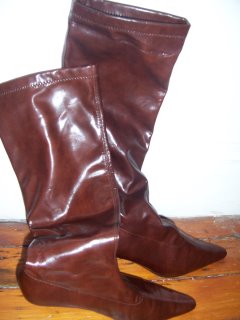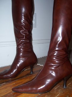 So let’s see: knee high pointy toed deep burgundy stretch boots…and they were only $15!!?!? They were a little snug, but I can’t find flip flops for $15! I had to get them.