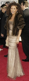 …Vanessa is getting a lil ‘old diva’ on me…this look is just not fresh. She reveals that she’s wearing a Carmen Marc Velvo dress, Fred Leighton jewels, and a Edwards-Lowell fur. She styled herself in about an hour and…it shows. My boyfriend says, “F*ck she looks good.” What does he know? He explains, “It’s the big hair.” Riiiiight.