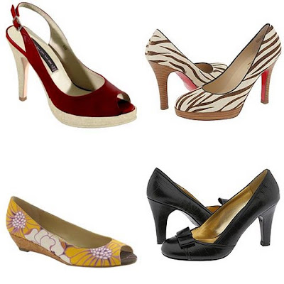 Bottom Row: Bunni Peep Toe Wedges, $70, www.stevemadden.com; Oh!Deer Bette Pumps, $111, zappos.com