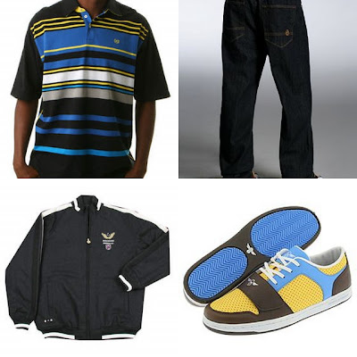 Top Row: Phat Farm The Plunge Striped Polo, $38, www.dryjays.com; Basic 5 Pocket Slub Denim Pant 32 Inseam, $48, www.phatfarm.com.