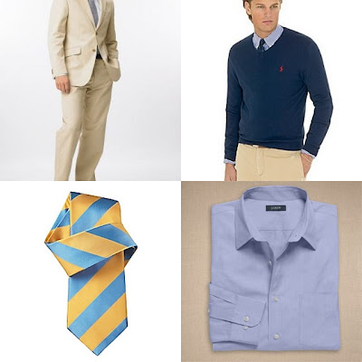 Top Row: Twill Modern Suit, $128-$250, www.bananarepublic.com; Polo By Ralph Lauren V-Neck Pima Cotton Sweater, $80, www.macys.com.