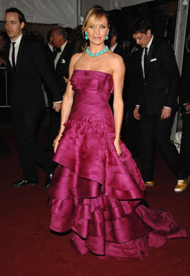 …Cameron Diaz! The color on this dress is searingly beautiful, and the juxtaposition of the raspberry of the dress and the turquoise jewelry is sick. The gown is embellished yet not overdone, and she allows her style to speak through vibrant colors and well plucked jewels.