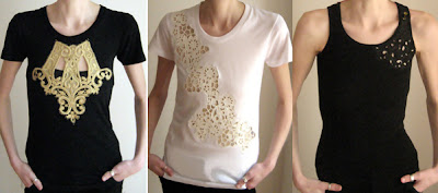 Anyway I also had to jump in to tell you about a new t-shirt line one of my colleagues, Janet Kim, recently created called Graey. She says she started her collection to, “incorporate couture details into affordable ready-to-wear.” Her Spring ’07 collection is comprised of, “tanks and tees embellished with a couture technique where lace is embroidered onto the fabric and the original fabric is cut away on the back to reveal what’s underneath.” Take a look: