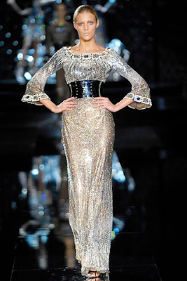 D&G loves the metallic look with the cinched belt. If you recall, Naomi Campbell similarly wore a silver Dolce and Gabbana gown…