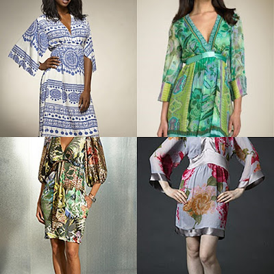 Bottom Row: Satin Basketweave Print Puff Sleeve Dress, $178, www.cache.com; Floral Print Kimono Dresses by Anjali Kumar, $308, www.edressme.com.