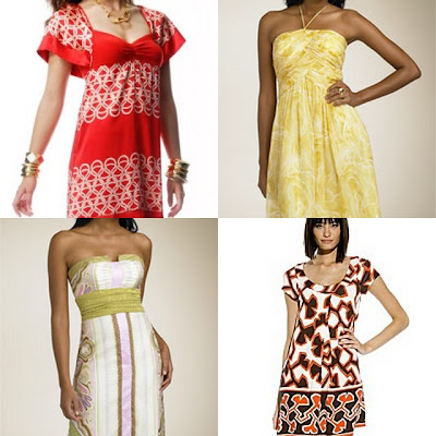 Top Row: Silk Woven Print Flutter Sleeve Dress, $98, www.bebe.com; Laundry by Shelli Segal Print Chiffon Halter Dress, $255, www.nordstrom.com.