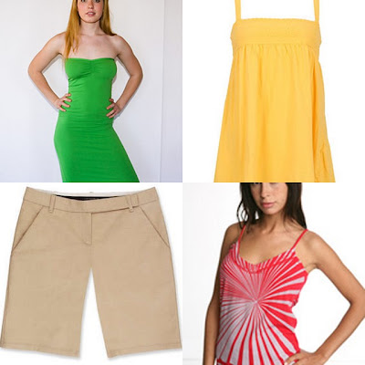 Top Row: Cotton Spandex Jersey Strapless Ruched Dress, $36, www.americanapparel.net; Embroidered Knit Top, $14.80, www.forever21.com.