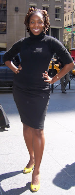 …looked amazing in a black turtleneck sweater, pencil skirt, and hot suede mustard peep toes.