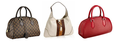 Left to right: Louis Vuitton Damier Canvas Duomo , $1,360, www.eluxury.com; Gucci Ivory Leather Bouvier Hobo , $876, www.bluefly.com; Louis Vuitton Epi Leather Jasmin , $1,120, www.eluxury.com