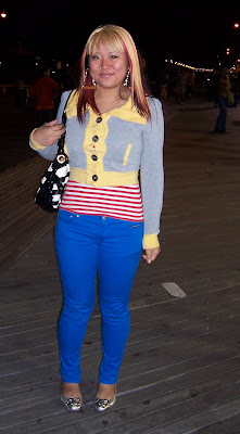 From her colorful hair to her gold bamboo earrings, on to the artful way she mixed and matched patterns, styles, and colors, this girl was working her own look in a very urban chic way. I personally loved her skinny blue jeans and prepster with a twist yellow and gray sweater.