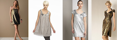 Left to Right: Strapless Metallic Dress, $148, www.bananarepublic.com; Aqua Paneled Sequin Tunic, $194, www.bloomingdales.com; Nicole Miller Sequined Dress, $294, www.neimanmarcus.com; Tadashi Cold Shoulder Dress, $350, www.bloomingdales.com.