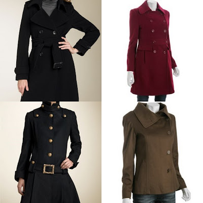 Top Row: London Fog Long Wool Trench Coat, $188, www.nordstrom.com; Kenneth Cole Reaction Rose wool double breasted tab coat, $168, www.bluefly.com.