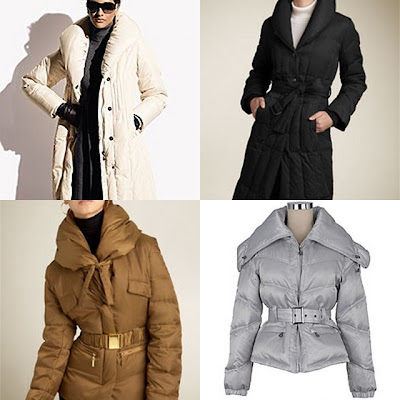 Top Row: Down Coat with Pillow Collar, $165, www.bloomingdales.com; Jones New York Down Quilt Coat, $112, www.nordstrom.com.
