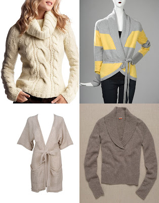 Top Row: Cable Knit Cowl Neck sweater, $88, www.gap.com; Autumn Cashmere Shawl Collar Wrap Cardigan, $342, www.ronherman.com.