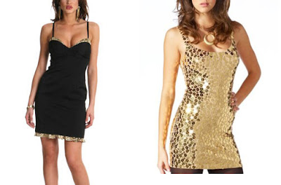 Left to Right: Guess Jeans Felina Dress, $98, www.guess.com; Paillette Knit Tank Dress, $129, www.bebe.com.