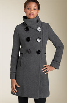 Hey Jen! I wasn’t able to find the exact coat, but found a couple that came close. If you simply want a gray coat with a funnel collar and big buttons (like Rihanna), you can go with the following Soia & Kyo Saucer Button Walking Coat…