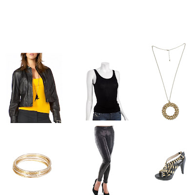 Top Row: Leather Mandarin Collar Jacket, $198, www.bebe.com; Clu Black Rib Knit Tank, $35, www.bluefly.com; Medallion Necklace, $5.80, www.forever21.com.