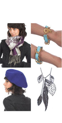 Bottom Row: Classic Beret, $20; Falling Leaves Necklace, $15.