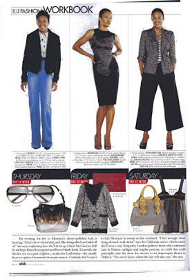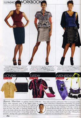 The Elle spread showcases what Ms. Morrison would wear in a typical week–everything from tailored shift dresses by Richard Chai to smart wool Givenchy jackets paired with Earnest Sewn jeans or Yves Saint Laurent skirts, topped off with (of course) a pair of Louboutins.