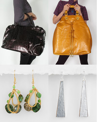 Bottom Row: Green and Gold Glass Bead Earrings, $15; Silver and Leather Dangle Earrings, $15.