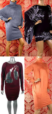 Top Row: Grey Turtleneck Sweater Dress, $65; Printed Kimono Sleeve Dress, $70.
