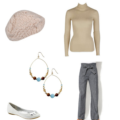 Slouchy Knit Beret, $10.80, www.forever21.com; Max Studio Silk Cashmere Turtleneck Sweater, $98, www.maxstudio.com; Tribeca by Kenneth Cole Rock Candy Flats, $40, www.piperlime.com; Women’s Beaded Hoop Earrings, $7.50, www.oldnavy.com; ASOS Paperbag Stripe Trouser, $47, www.asos.com.