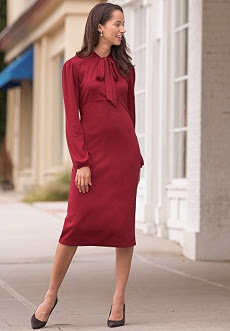 She says, “I just so happened to be web-shopping and found a dress that is very similar for under $50. It can be found on Chadwicks and comes in cinnamon and aubergine (purple). It’s on sale for $39.99.”