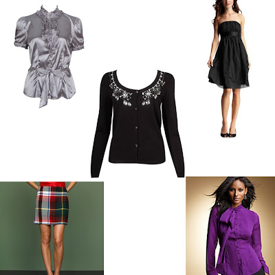 Pair the satin or tie neck blouse with a black skirt or trouser; match the tartan mini with a white shirt and jacket, and throw the glam cardigan over the strapless dress (or anything really–it’s dressy enough on it’s own!)