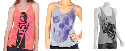 Left to Right: Le Magnifique Racer Back Tank, $74, www.shopatmilk.com; Vato Calavera Racer Back Tank, $55, www.madisonlosangeles.com; Torn Grey ‘Anne’ Zebra Tank, $35, www.bluefly.com.