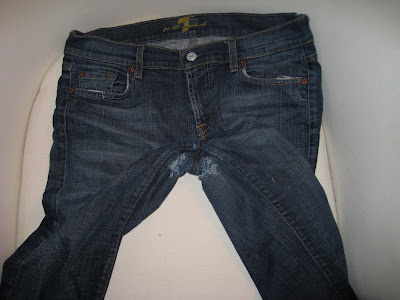 Well, I recently had a situation to which, I think, a lot of you curvy girls can relate: My absolute favorite pair of Seven Jeans (purchased at Saks for $187) had sprouted two gaping frays at the thighs, similar to this: