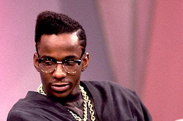 He was rocking the slanted high top fade with a blonde streak, a bright colored jacket, patchworked jeans, and Nike high tops (oops, just noticed the Africa medallion!).