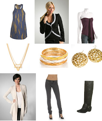 Bottom Row: Velvet Sharon Wrap, $79, www.revolveclothing.com; Corpus Alpha Gray Jeans, $84, www.revolveclothing.com; One of 2 Women’s Flat Knee High Boot, $132, www.endless.com.