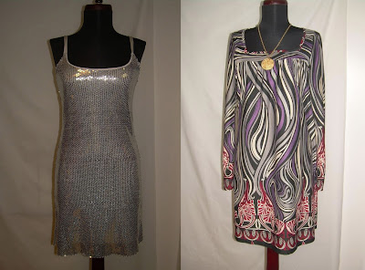 Silver Mesh Camisole Dress, $45; Print Dress, $30.