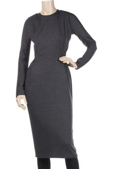 …According to this source, she’s wearing a Calvin Klein creation. The closest approximation I could find was this Calvin Klein Wool Jersey Dress…