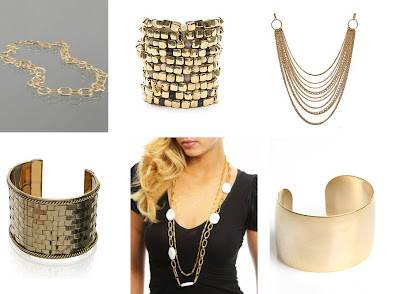 Bottom Row: ASOS Woven Metal Cuff, $13, www.asos.com; Chains and Gem Necklace, $64, www.bebe.com; Kimberly Faith Gold Cuff, $53, Couture Candy.