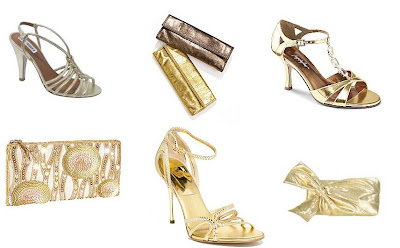 Top Row: Knotted Gold Leather Sandals, $30, www.stevemadden.com; Franchi Metallic Flap Clutch, $66, www.bloomingdales.com; Jacqueline Ferrar Krystal Sandal, $50, www.jcpenney.com.