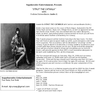 *Wanna learn how to strut the Runway like a superstar??? Fashion Bomb friend Andre J is offering classes in NYC for men and women, young and old titled “Strut the Catwalk.”
