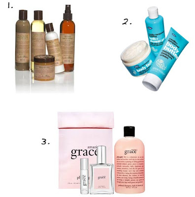 1. Best Tressed Hair Set, $58, www.carolsdaughter.com. 2. Bliss Vanilla + Bergamot Set, $84, www.blissworld.com. 3. Philosophy Amazing Grace Gift Set, $68, www.sephora.com.