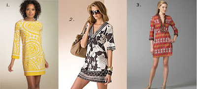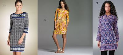 1. Maggie London Printed Jersey Knit Dress, $128, www.nordstrom.com. 2. Printed Linen Antonia Dress, $165, www.jcrew.com. 3. What Comes around Goes Around Goa Tunic, $187, shopbop.com