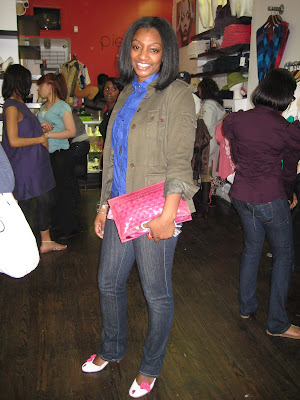 Shannon from Parlour Magazine (www.parlourmagazine.com) was in the house with a plum clutch worn with skinny jeans, a blue frilly top, and an army green jacket. If you haven’t heard of Parlour, check it out! It’s a webzine focused on global news, culture, and music.