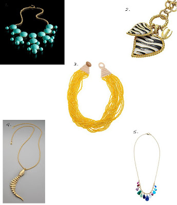 1. Bubble Necklace, $150, www.jcrew.com. 2. Just Cavalli Zebra Heart Necklace, $273, www.eluxury.com. 3. Concentric Glass Bead Necklace, $28, www.urbanoutfitters.com. 4. Kenneth Jay Lane Snake Pendant Necklace, $77, shopbop.com 5. Women’s Multi Stone Necklace, $10, oldnavy.com****************************************************************