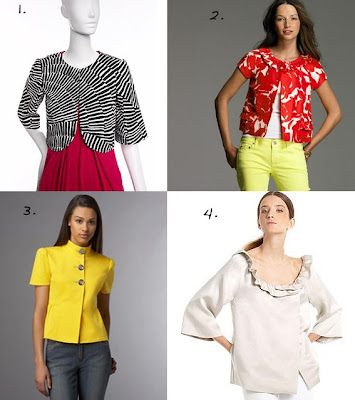 1. Trina Turk Burke Jacket, $228, www.searlenyc.com. 2. Brushstroke Print Chessy Jacket, $148, www.jcrew.com. 3. Michael Kors Ponte Jacket, $84, www.lordandtaylor.com. 4. Loeffler Randal Silk Ruffle Jacket, $565, www.eluxury.com.