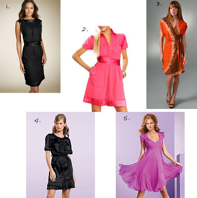 1. Maggy London Cap Sleeve Chiffon Dress, $138, www.nordstrom.com. 2. Bebe Silk Sash Waist Dress, $129, www.bebe.com. 3. Diane von Furstnberg Tie-Dye Wrap Dress, $398, shopbop.com 4. Phoebe Couture Ruffled Shirtdress, $260, www.bloomingdales.com. 5. Tadashi Silk Dance Dress, $330, www.bloomingdales.com.