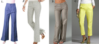 1. Julie Haus Hi-Waist Frida Pant, $275. 2. BCBG Indigo Striped Carla Slim Flare Pant, $178. 3. Holly Herringbone Pant, $228. 4. J.Crew City Fit Italian Linen Pant, $250.