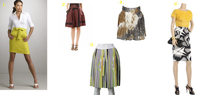 1. Milly Bow Front Pencil Skirt, $137. 2. Banana Republic Linen Abstract Skirt, $62.30. 3. Forever 21 Spotted Woven Skirt, $22.80. 4. Tibi Pleated Skirt, $273.5. Tracy Reese Canvas Printed Pencil Skirt, $240.