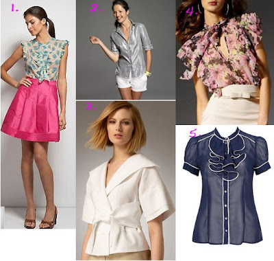 1. Diane Von Furstenberg Carone Top, $198. 2. J.Crew Whisper Lame Shirt, $110. 3. Anne Klein Tie Front Shirt, $89. 4. Bow Tie Floral Top, $79. 5. Chiffon Ruffle Top, $22.80.
