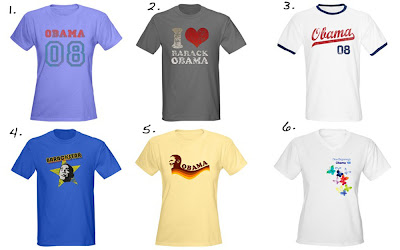 1. Vintage Women’s Shirt, $27. 2. I love Barack Obama Shirt, $27. 3. Team Obama Ringer Tee, $21. 4. BarackStar T, $23. 5. Barack Obama Women’s Light T, $19. 6. Obama Shops Women’s V-Neck T, $19.