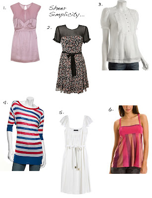1. Nanette Lepore bustier, $160. 2. “Ditsy” dress by Top Shop, approximately $100. 3. Sine blouse, $117. 4. Millions of Smiles Sheer Boatneck Sweater, $139. Â 5. T-Bags Belted Jersey Dress, $175. 6. Sheer Cropped Top, $17.80.