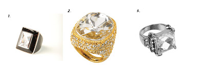 1. Noir Rectangle Stone Cocktail Ring, $60. 2. Kenneth Jay Lane Roud Gold Pave Ring, $145. 3. Royalty Ring, $4.80.